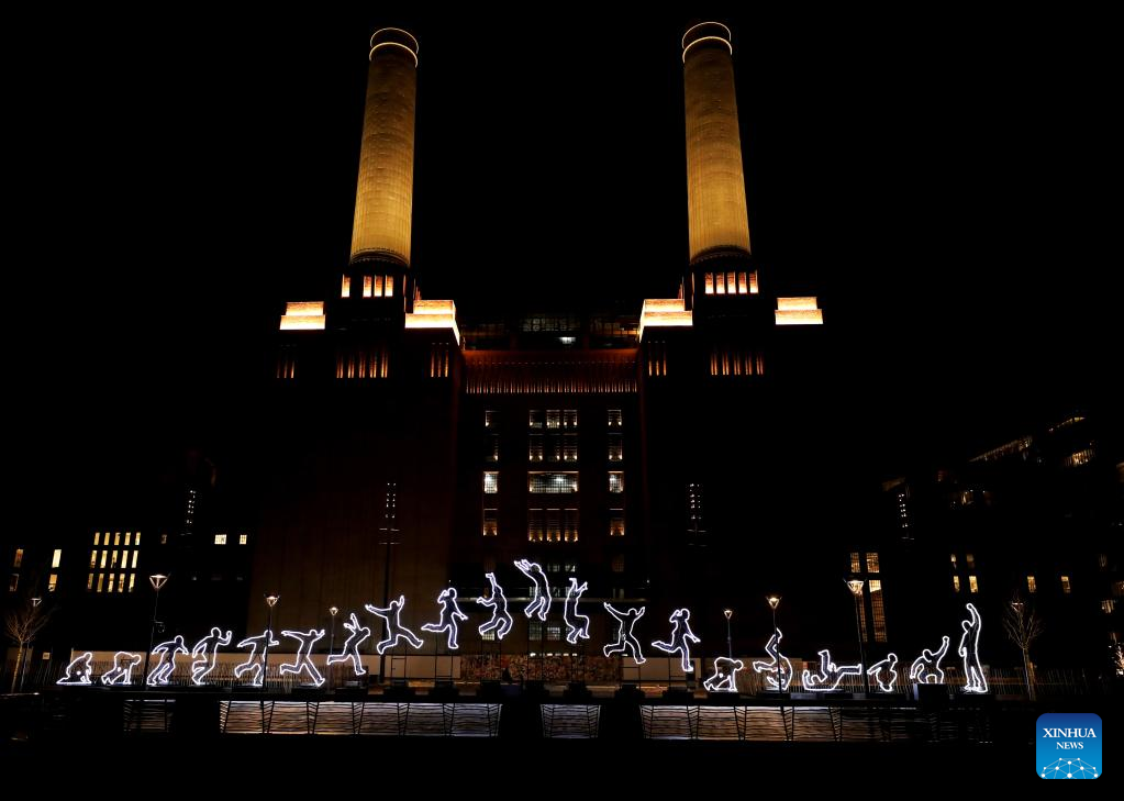 An installation called Run Beyond is seen during the Light Festival at Battersea Power Station in London, Britain, Feb. 17, 2022. The Light Festival is held from Jan. 13 to Feb. 27, 2022. (Xinhua/Li Ying)