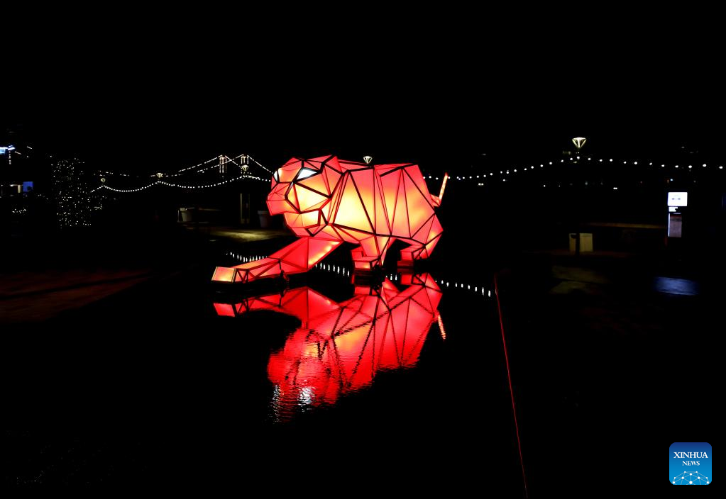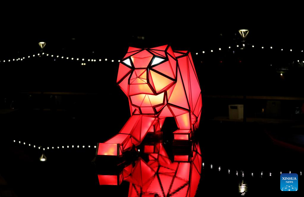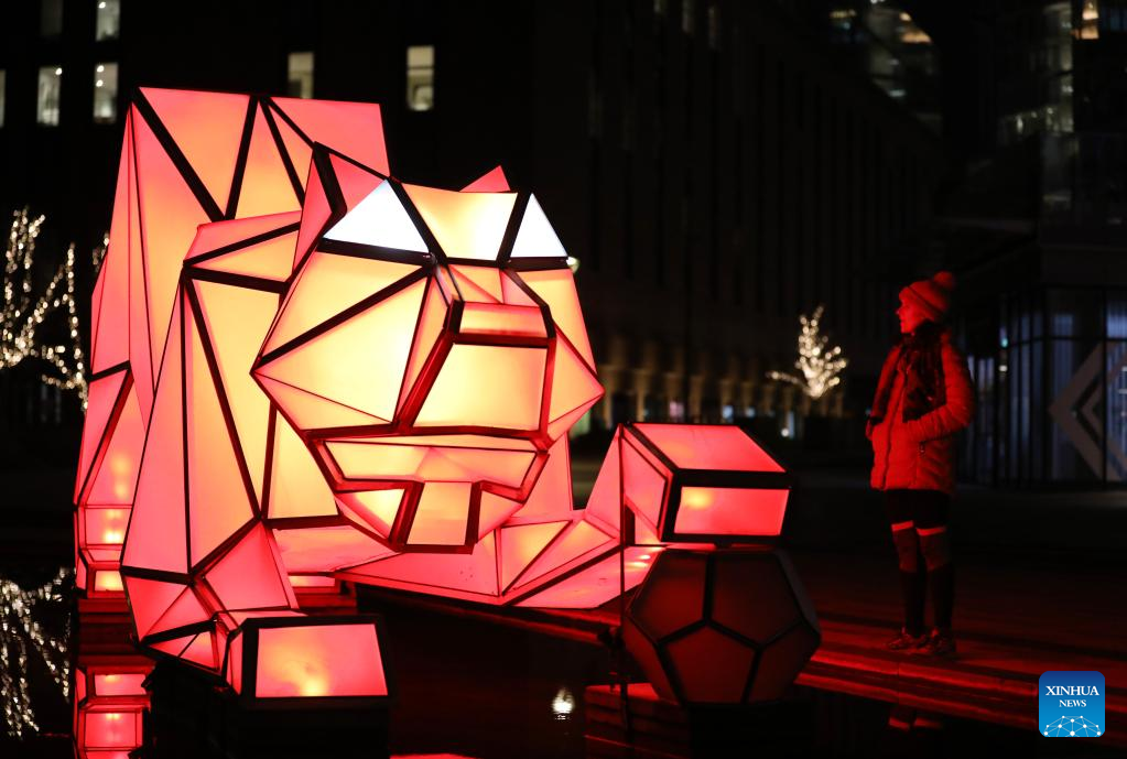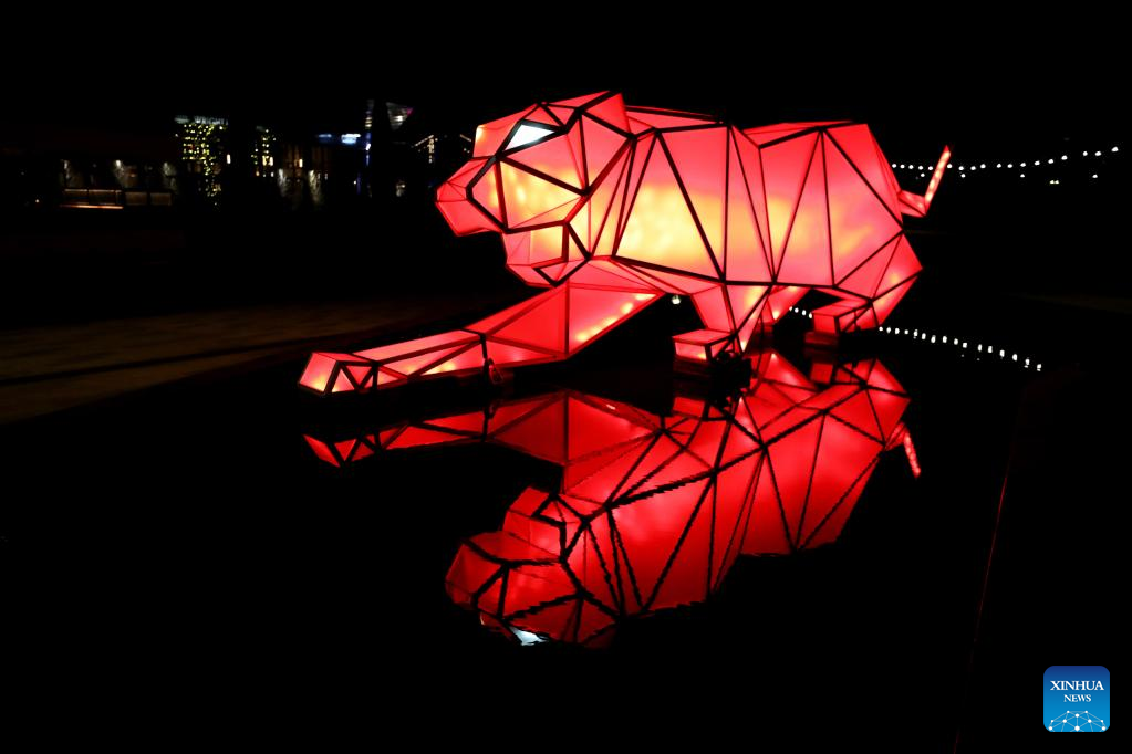 An installation called Digital Origami Tiger is seen during the Light Festival at Battersea Power Station in London, Britain, Feb. 17, 2022. The Light Festival is held from Jan. 13 to Feb. 27, 2022. (Xinhua/Li Ying)