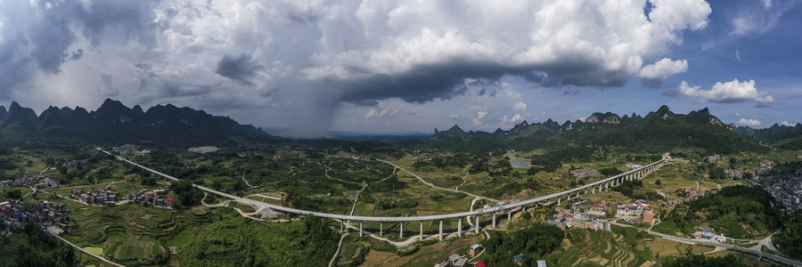 Aerial panoramic photo taken on Aug. 16, 2022 shows the construction site of the Guiyang-Nanning high-speed railway in Huanjiang Maonan Autonomous County, south China's Guangxi Zhuang Autonomous Region. (Xinhua/Cao Yiming)