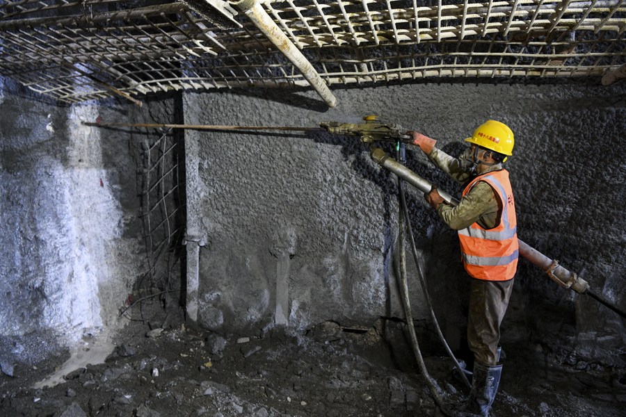 A worker operates at Jiuwandashan No.4 tunnel along the Guiyang-Nanning high-speed railway in Huanjiang Maonan Autonomous County, south China's Guangxi Zhuang Autonomous Region, Aug. 16, 2022. (Xinhua/Cao Yiming)