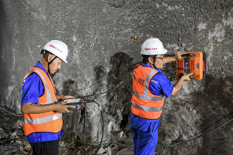 Technicians work at Jiuwandashan No.4 tunnel along the Guiyang-Nanning high-speed railway in Huanjiang Maonan Autonomous County, south China's Guangxi Zhuang Autonomous Region, Aug. 16, 2022. (Xinhua/Cao Yiming)
