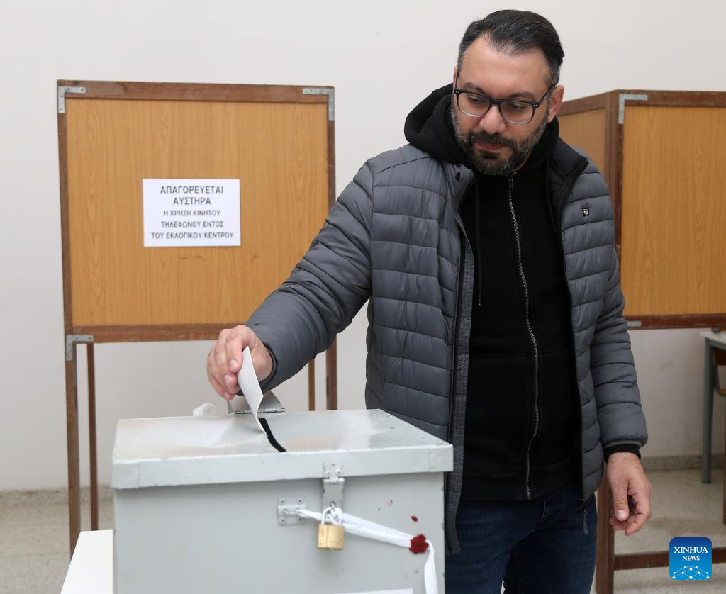 A man votes at a polling station in Nicosia, Cyprus, Feb. 12, 2023. The second round of presidential elections started in Cyprus on Sunday morning as more than 1,000 polling stations opened for voting. Two veteran diplomats are vying for the country's presidency for the next five years. (Photo by George Christophorou/Xinhua)