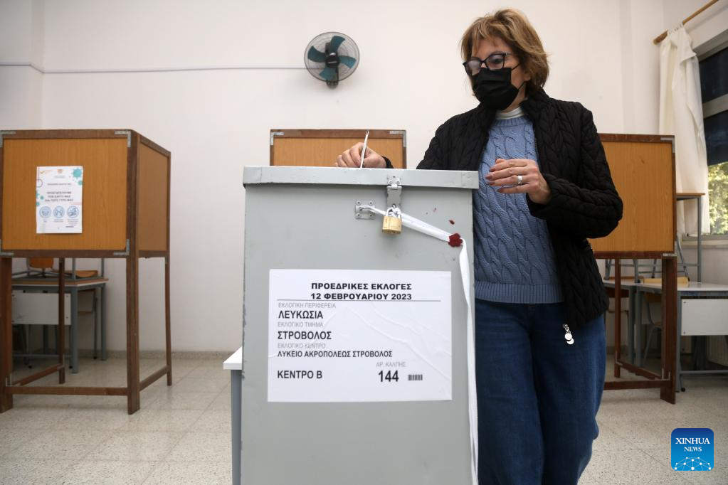 A woman votes at a polling station in Nicosia, Cyprus, Feb. 12, 2023. The second round of presidential elections started in Cyprus on Sunday morning as more than 1,000 polling stations opened for voting. Two veteran diplomats are vying for the country's presidency for the next five years. (Photo by George Christophorou/Xinhua)