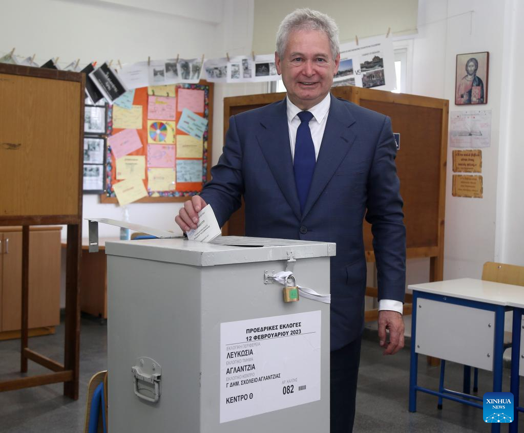Andreas Mavroyiannis, a former envoy to the United Nations (UN), votes at a polling station in Nicosia, Cyprus, Feb. 12, 2023. Mavroyiannis also ran as an independent and has the support of the left-wing AKEL party. The second round of presidential elections started in Cyprus on Sunday morning as more than 1,000 polling stations opened for voting. Two veteran diplomats are vying for the country's presidency for the next five years. (Photo by George Christophorou/Xinhua)