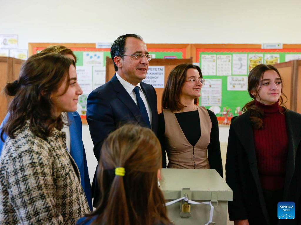 Former Cypriot Foreign Minister Nicos Christodoulides (3rd R), running as an independent, votes at a polling station in Pafos, Cyprus, Feb. 12, 2023. The second round of presidential elections started in Cyprus on Sunday morning as more than 1,000 polling stations opened for voting. Two veteran diplomats are vying for the country's presidency for the next five years. (PIO/Handout via Xinhua)