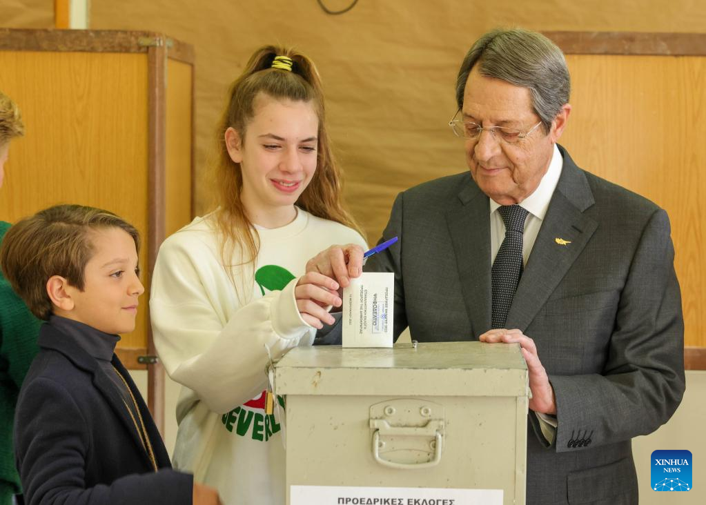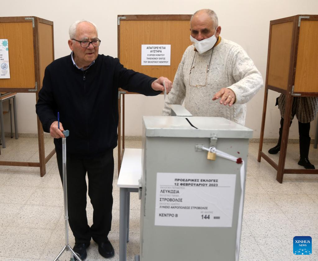 Cyprus' outgoing president Nicos Anastasiades (R) votes at a polling station in Limassol, Cyprus, Feb. 12, 2023. The second round of presidential elections started in Cyprus on Sunday morning as more than 1,000 polling stations opened for voting. Two veteran diplomats are vying for the country's presidency for the next five years. (PIO/Handout via Xinhua)