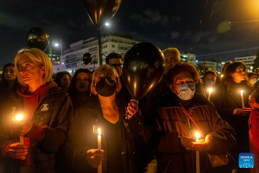 People mourn victims of a train crash in Syntagma Square in Athens, Greece, on March 3, 2023. The death toll from Tuesday night's train crash in central Greece has increased to 57, authorities said on Thursday. (Xinhua/Marios Lolos)