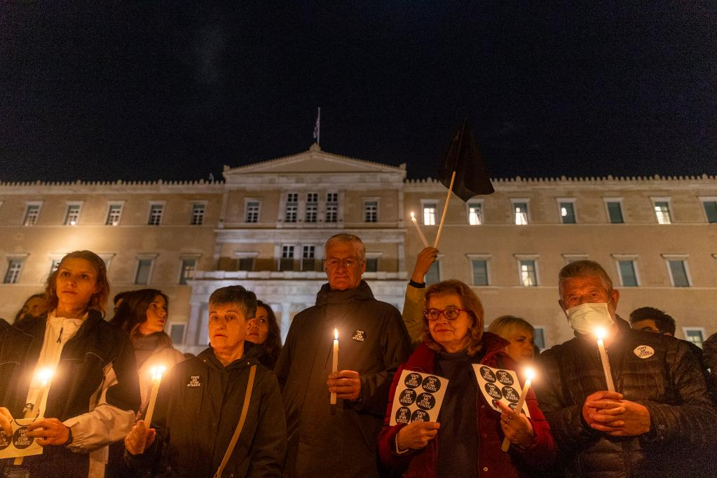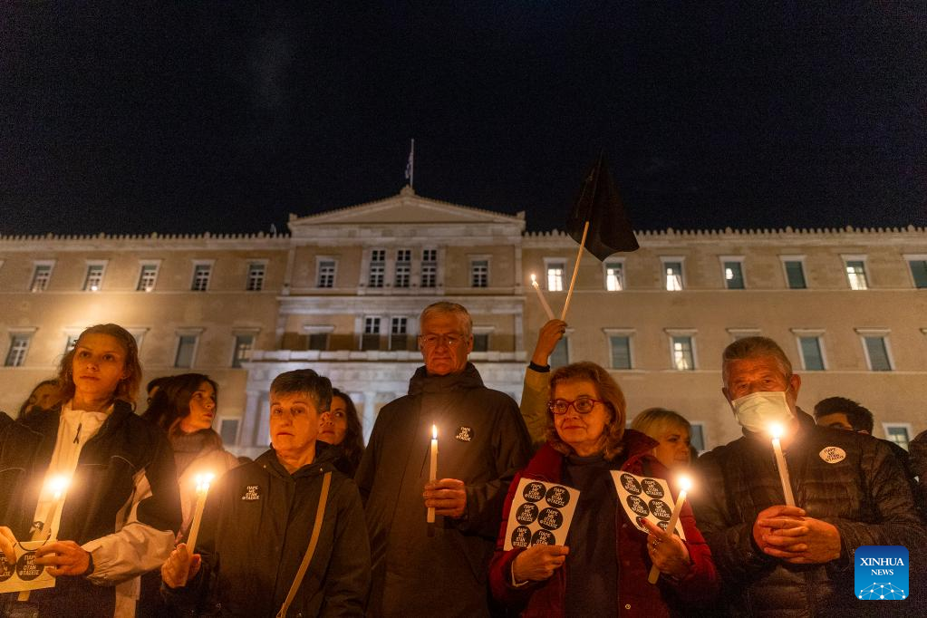 People hold candles to mourn victims of a train crash in Syntagma Square in Athens, Greece, on March 3, 2023. The death toll from Tuesday night's train crash in central Greece has increased to 57, authorities said on Thursday. (Xinhua/Marios Lolos)