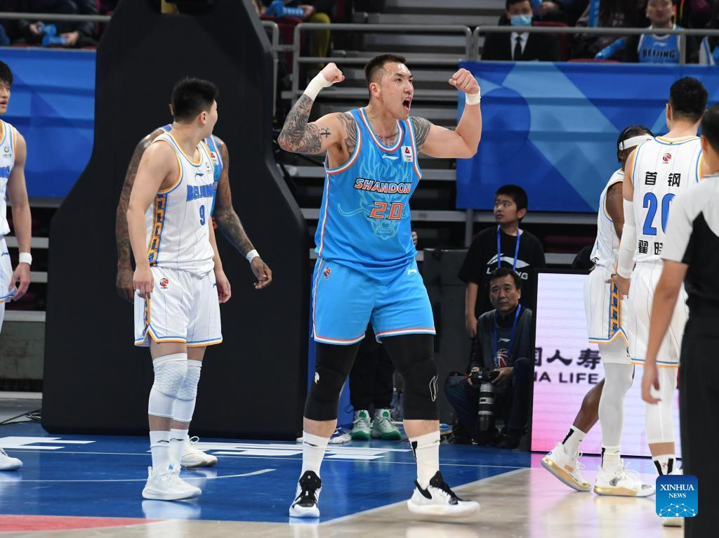 (230319) -- BEIJING, March 19, 2023 (Xinhua) -- Tao Hanlin (C) of Shandong Heroes celebrates scoring during the 37th round match between Beijing Ducks and Shandong Heroes at 2022-2023 season of the Chinese Basketball Association (CBA) league in Beijing, capital of China, March 19, 2023. (Xinhua/Zhang Chenlin)