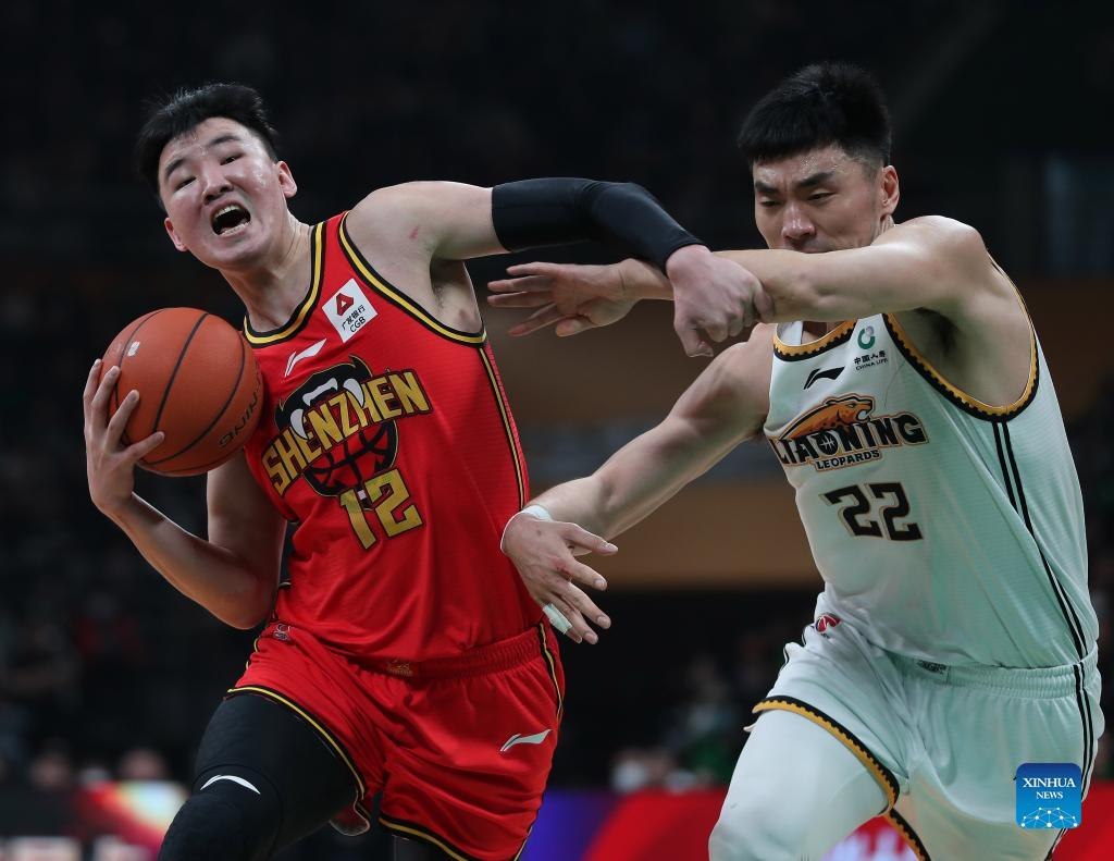 Gu Quan (L) of Shenzhen Leopards breaks through during the 37th round match between Liaoning Flying Leopards and Shenzhen Leopards at the 2022-2023 season of the Chinese Basketball Association (CBA) league in Shenyang, northeast China's Liaoning Province, March 19, 2023. (Xinhua/Long Lei)