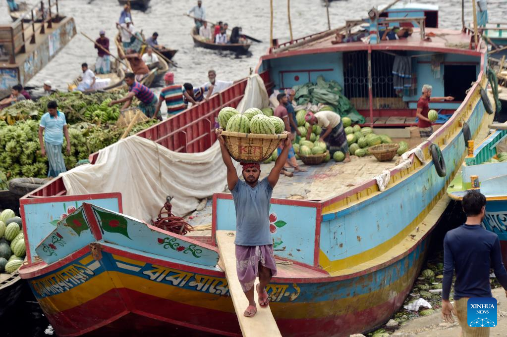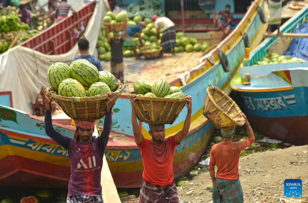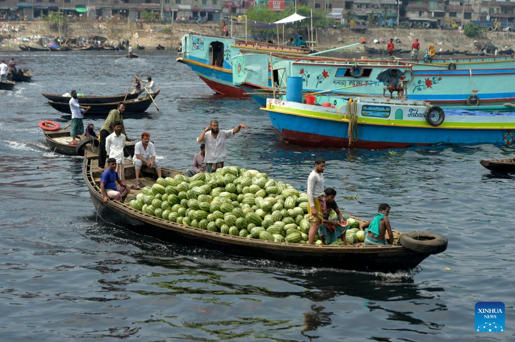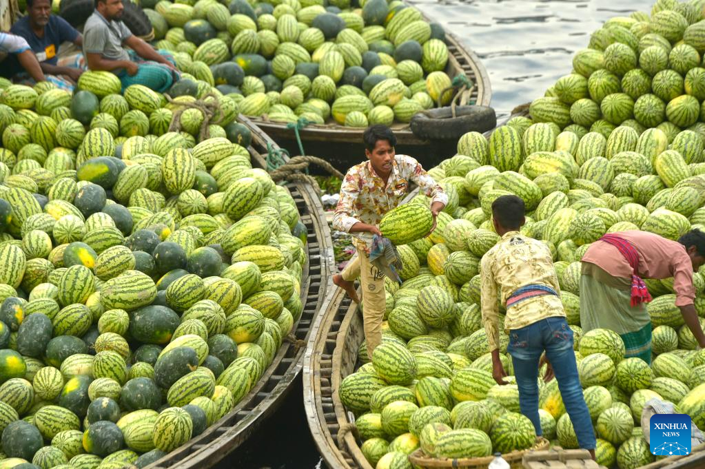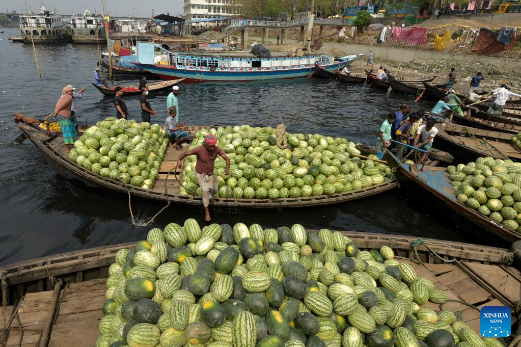 Boats loaded with watermelons are berthed in a river near a wholesale market in Dhaka, Bangladesh, March 21, 2023. (Xinhua)