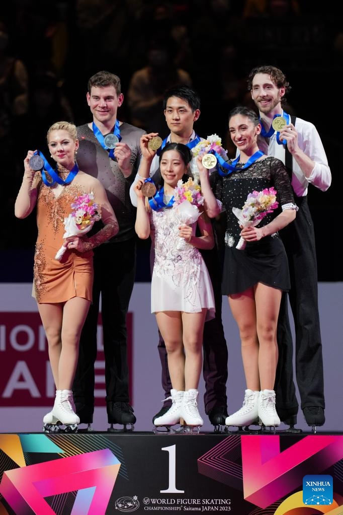Alexa Knierim (1st L)/Brandon Frazier (2nd L) of the United States, Miura Riku (bottom C)/Kihara Ryuichi (top C) of Japan, Sara Conti (2nd R)/Niccolo Macii (1st R) of Italy pose for photos after the pairs free skating at the ISU World Figure Skating Championships at Saitama Super Arena in Saitama, Japan, March 23, 2023. (Xinhua/Zhang Xiaoyu)