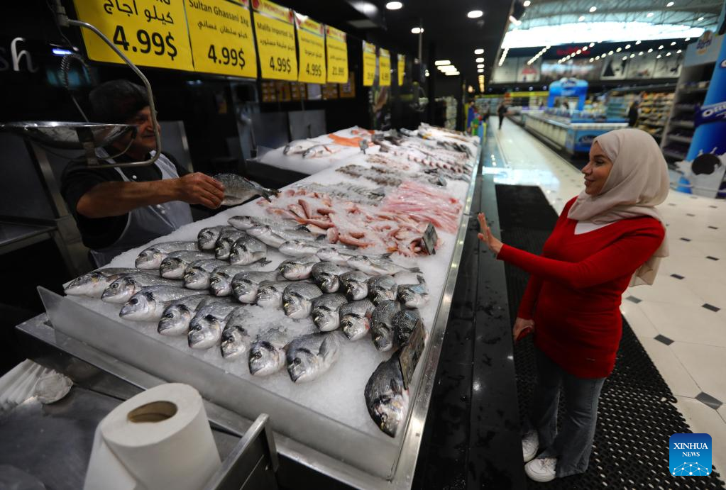 A woman buys fish in a supermarket in Beirut, Lebanon, on March 20, 2023. (Xinhua/Bilal Jawich)