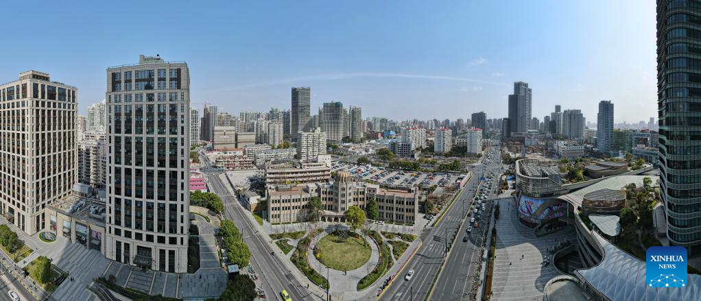 This aerial photo taken on March 16, 2023 shows a view of the site of Henry Lester Institute of Technical Education, a heritage building which is now home to the Design Innovation Institute Shanghai, in east China's Shanghai. The Henry Lester Institute of Technical Education, one of the earliest technical schools in east China's Shanghai, has finished its renovation and has been transformed into the Design Innovation Institute Shanghai, with the original architecture well preserved.