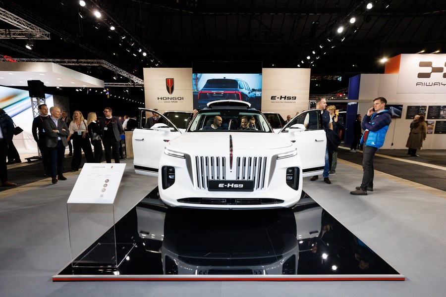 People look at a Hongqi electric vehicle at the Swedish eCarExpo 2023 in Stockholm, Sweden, on Feb. 3, 2023. (Photo by Wei Xuechao/Xinhua)
