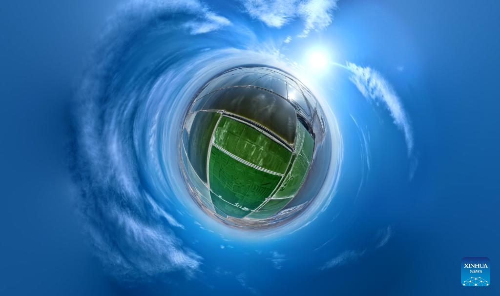 This aerial panoramic photo taken on June 8, 2023 shows the scenery of the Qairhan salt lake in Golmud, northwest China's Qinghai Province. The Qairhan salt lake, with a total area of 5,856 square kilometers, has been the largest potash fertilizer producing base in China. (Xinhua/Zhang Hongxiang)