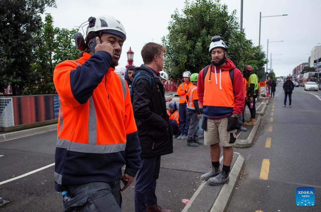 Workers at a building site where a gun incident took place are evacuated to a street in Auckland, New Zealand, on July 20, 2023. Three people, including the gunman, were dead and six others were injured in a "serious" gun incident in Auckland, a city in New Zealand's North Island, Prime Minister Chris Hipkins said on Thursday. (Photo by Zhao Gang/Xinhua)