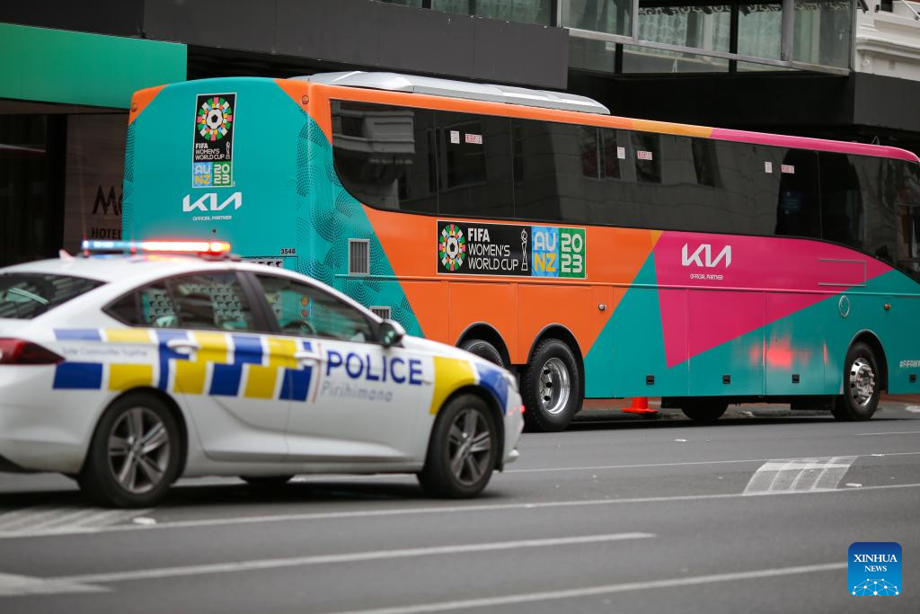 A police car runs past a bus for FIFA Women's World Cup 2023 in Auckland, New Zealand, on July 20, 2023. Three people, including the gunman, were dead and six others were injured in a "serious" gun incident in Auckland, a city in New Zealand's North Island, Prime Minister Chris Hipkins said on Thursday. (Photo by Zhao Gang/Xinhua)