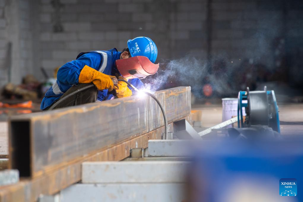 A welder is at work at the construction site of the Yongchuan South Station in the Sichuan-Chongqing section of the Chongqing-Kunming high-speed railway in southwest China's Chongqing Municipality, Sept. 20, 2023. The 699-kilometer-long Chongqing-Kunming high-speed railway, with a designed speed of 350 kilometers per hour, is a key constituent of the railway corridor linking China's capital Beijing and Kunming in southwest China's Yunnan Province. (Xinhua/Tang Yi)
