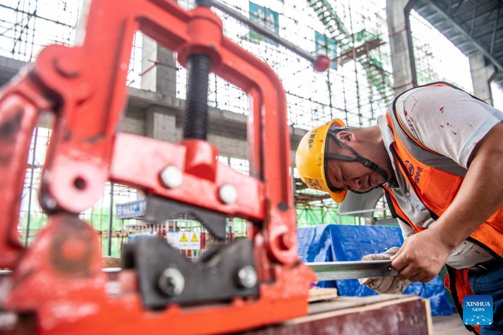 A worker is engaged in building activities at the construction site of the Jiangjin North Station in the Sichuan-Chongqing section of the Chongqing-Kunming high-speed railway in southwest China's Chongqing Municipality, Sept. 20, 2023. The 699-kilometer-long Chongqing-Kunming high-speed railway, with a designed speed of 350 kilometers per hour, is a key constituent of the railway corridor linking China's capital Beijing and Kunming in southwest China's Yunnan Province. (Xinhua/Tang Yi)