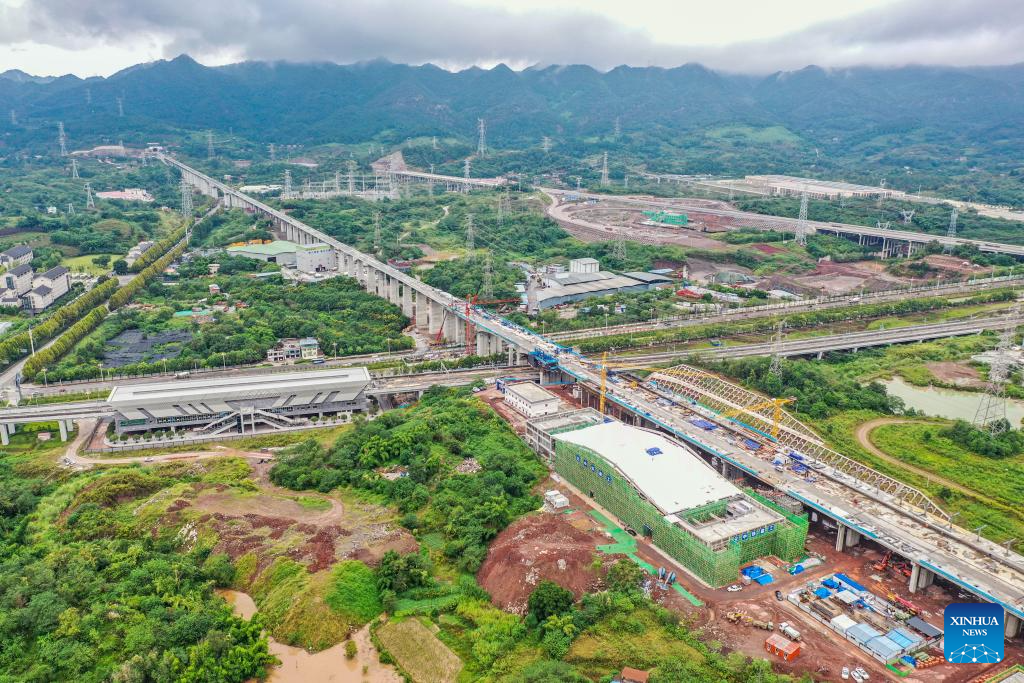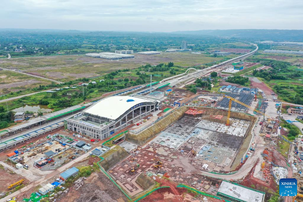 This aerial photo taken on Sept. 20, 2023 shows the Jiangjin North Station under construction in the Sichuan-Chongqing section of the Chongqing-Kunming high-speed railway in southwest China's Chongqing Municipality. The 699-kilometer-long Chongqing-Kunming high-speed railway, with a designed speed of 350 kilometers per hour, is a key constituent of the railway corridor linking China's capital Beijing and Kunming in southwest China's Yunnan Province. (Xinhua/Tang Yi)
