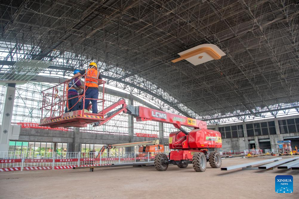Workers are engaged in building activities at the construction site of the Yongchuan South Station in the Sichuan-Chongqing section of the Chongqing-Kunming high-speed railway in southwest China's Chongqing Municipality, Sept. 20, 2023. The 699-kilometer-long Chongqing-Kunming high-speed railway, with a designed speed of 350 kilometers per hour, is a key constituent of the railway corridor linking China's capital Beijing and Kunming in southwest China's Yunnan Province. (Xinhua/Tang Yi)
