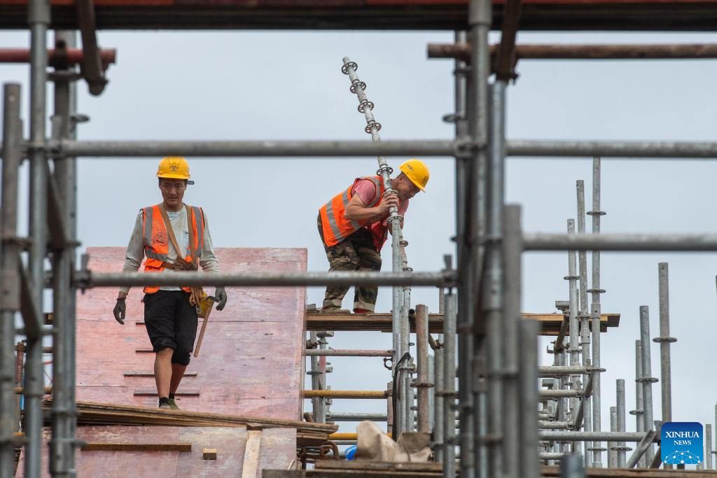 Workers are engaged in building activities at the construction site of the Jiangjin North Station in the Sichuan-Chongqing section of the Chongqing-Kunming high-speed railway in southwest China's Chongqing Municipality, Sept. 20, 2023. The 699-kilometer-long Chongqing-Kunming high-speed railway, with a designed speed of 350 kilometers per hour, is a key constituent of the railway corridor linking China's capital Beijing and Kunming in southwest China's Yunnan Province. (Xinhua/Tang Yi)