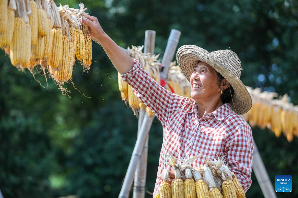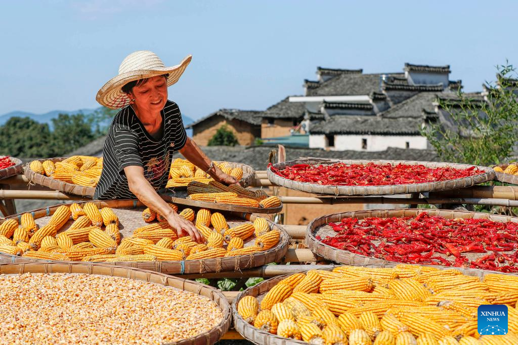 A villager dries corns on a drying yard at Chengkan Village in Huangshan City, east China's Anhui Province, Sept. 19, 2023. "Shaiqiu," or drying crops in autumn, is a rural tradition in China. Crops of different colors are placed to form various patterns which become attractions for tourists. (Photo by Fan Chengzhu/Xinhua)