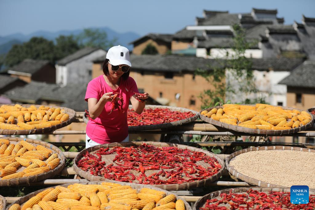 A villager dries crops on a drying yard at Yangchan Village in Huangshan City, east China's Anhui Province, Sept. 18, 2023. "Shaiqiu," or drying crops in autumn, is a rural tradition in China. Crops of different colors are placed to form various patterns which become attractions for tourists. (Photo by Fan Chengzhu/Xinhua)