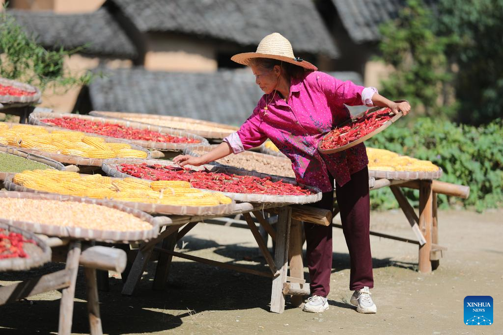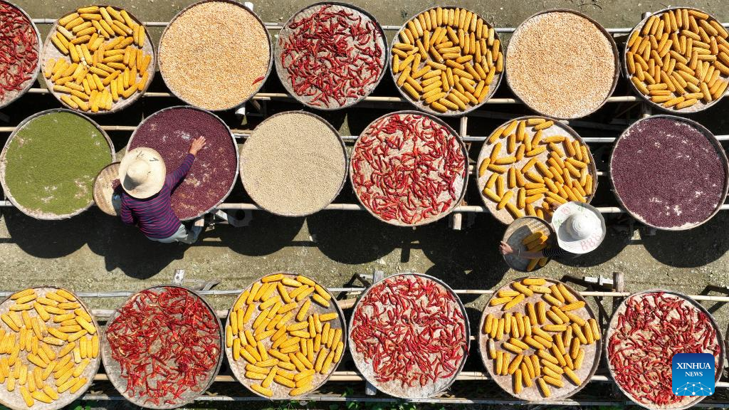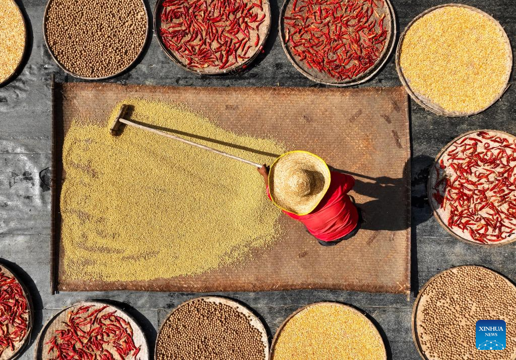 A villager dries crops on a drying yard at Yangchan Village in Huangshan City, east China's Anhui Province, Sept. 18, 2023. "Shaiqiu," or drying crops in autumn, is a rural tradition in China. Crops of different colors are placed to form various patterns which become attractions for tourists. (Photo by Shi Yalei/Xinhua)