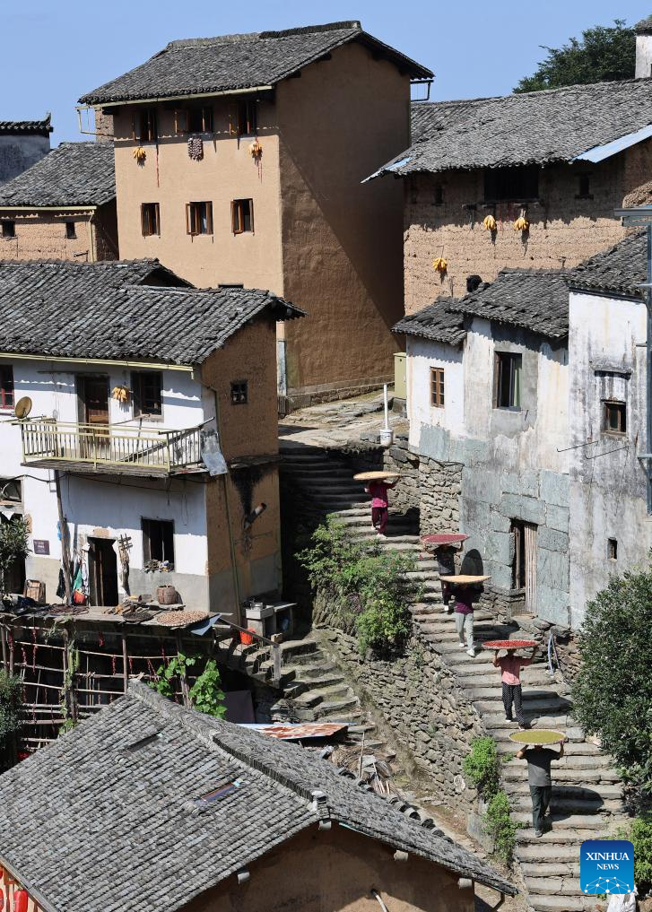 Villagers carry flat bamboo baskets for crops drying overhead at Yangchan Village in Huangshan City, east China's Anhui Province, Sept. 18, 2023. "Shaiqiu," or drying crops in autumn, is a rural tradition in China. Crops of different colors are placed to form various patterns which become attractions for tourists. (Photo by Fan Chengzhu/Xinhua)