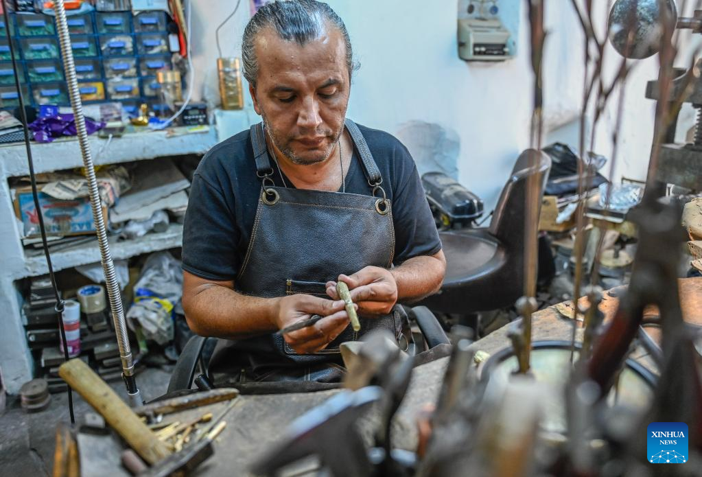 A silver artisan works at an atelier in Kalcilar Han or Kalcilar Inn, once a center of attraction filled with silver artisans, in Istanbul, Türkiye, on Sept. 13, 2023. (Photo by Omer Kuscu/Xinhua)