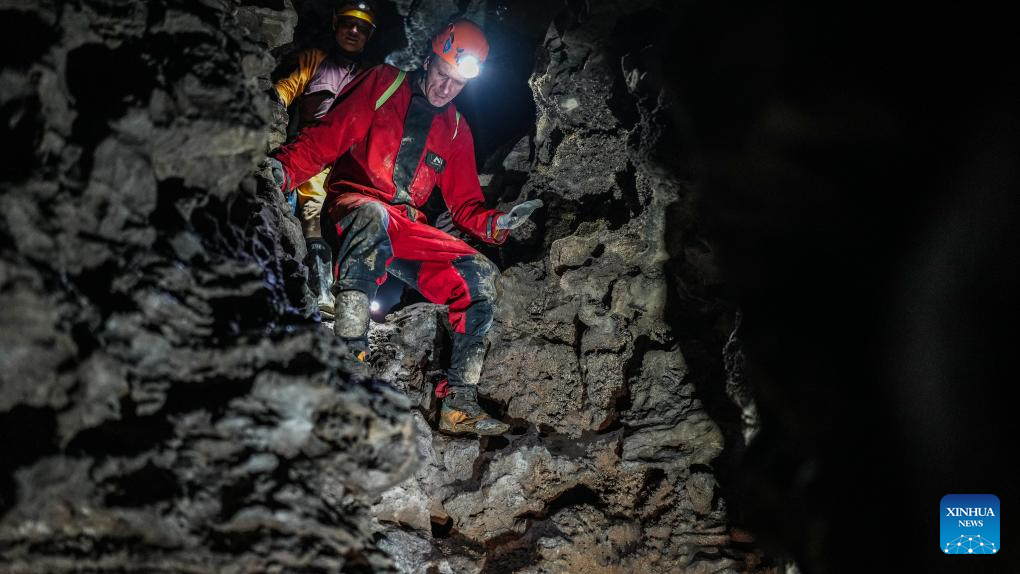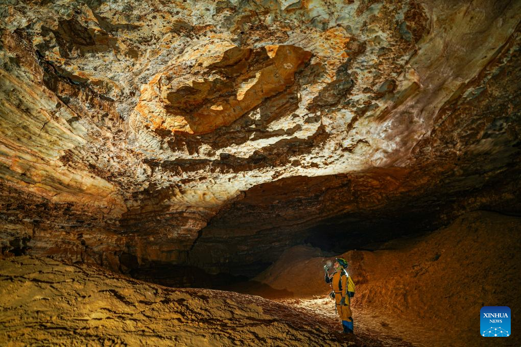 An Italian expert conducts an expedition inside a branch cave of Shuanghe Cave in Suiyang County, southwest China's Guizhou Province, Sept. 24, 2023.