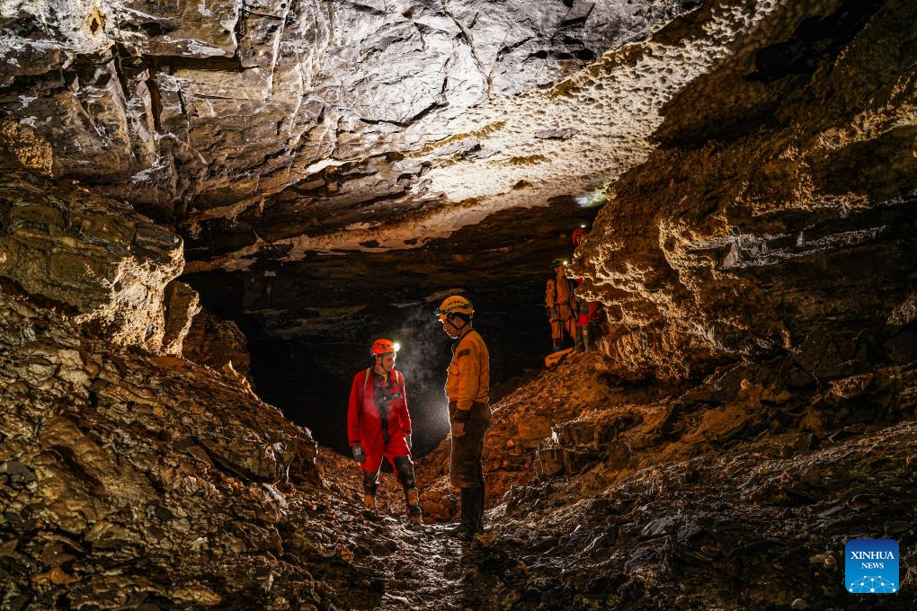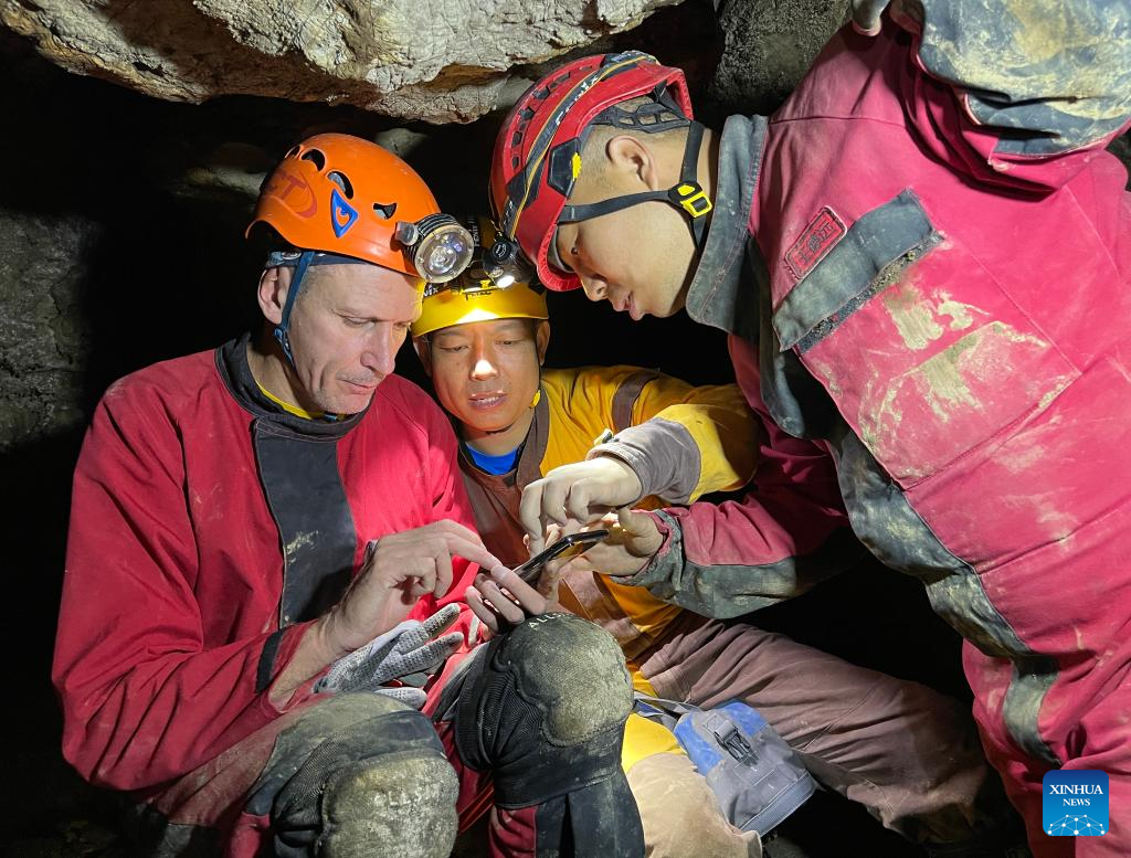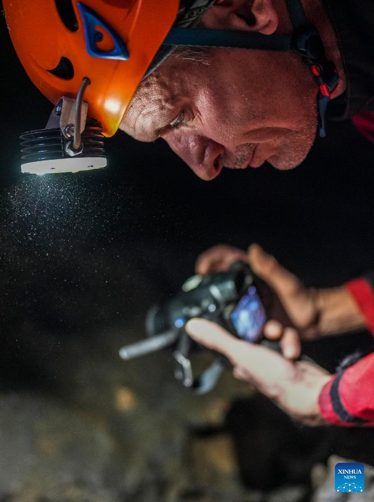An Italian expert and members of Guizhou provincial mountain resources institute conduct an expedition inside a branch cave of Shuanghe Cave in Suiyang County, southwest China's Guizhou Province, Sept. 24, 2023.