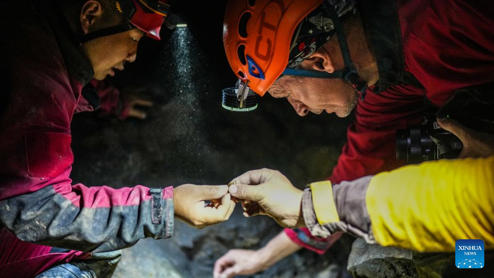 An Italian expert and members of Guizhou provincial mountain resources institute explore a branch cave of Shuanghe Cave in Suiyang County, southwest China's Guizhou Province, Sept. 24, 2023.