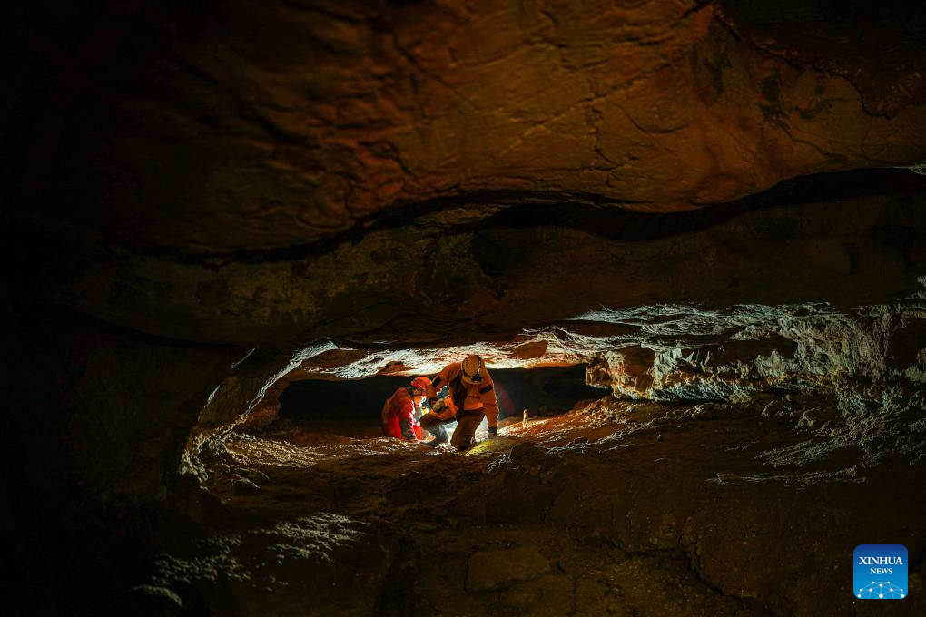 Members of Guizhou provincial mountain resources institute explore a branch cave of Shuanghe Cave in Suiyang County, southwest China's Guizhou Province, Sept. 23, 2023.