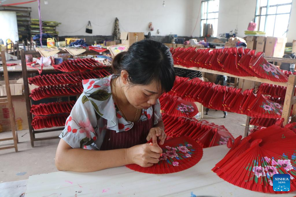 Yu Xiuying paints a wooden fan at the workshop of the Jiangxi Shenglian Fan Development Company Limited in Ganzhu Township in Guangchang County, east China's Jiangxi Province, on Sept. 12, 2023. (Xinhua/Zhu Yunuo)