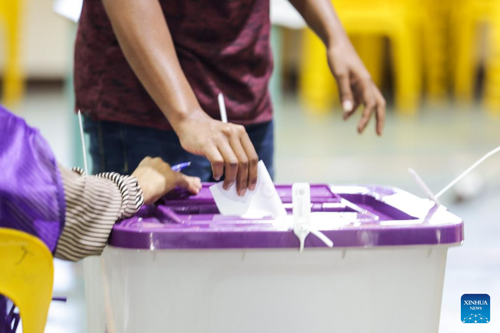 A voter casts his vote at a polling station in Male, Maldives, Sept. 30, 2023. The second round of presidential election in the Maldives kicked off on Saturday, after no candidate secured more than 50 percent of votes in the first round to win outright. (Xinhua)