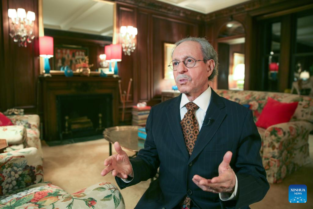 Robert Lawrence Kuhn, chairman of the Kuhn Foundation, speaks during an interview with Xinhua in New York, the United States, Nov. 22, 2023.(Xinhua/Hu Yousong)