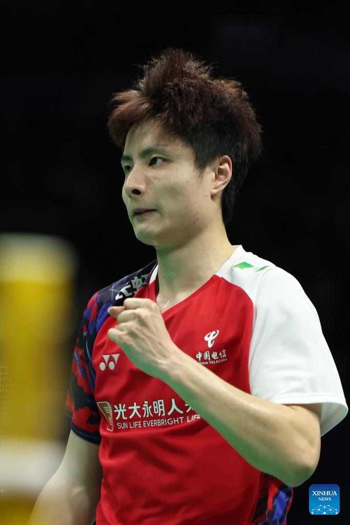 Shi Yuqi of China reacts in the singles match against Brian Yang of Canada during the group A match between China and Canada at BWF Thomas Cup Finals in Chengdu, southwest China's Sichuan Province, April 28, 2024. (Xinhua/Chen Bin)
