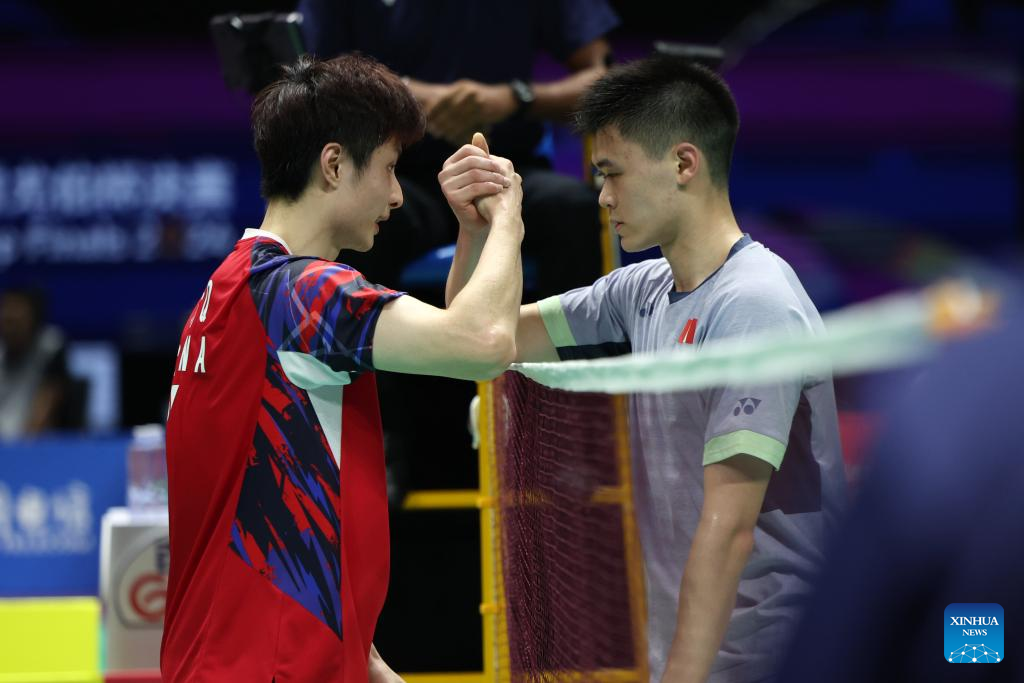 Shi Yuqi (L) of China greets Brian Yang of Canada after the singles match during the group A match between China and Canada at BWF Thomas Cup Finals in Chengdu, southwest China's Sichuan Province, April 28, 2024. (Xinhua/Chen Bin)