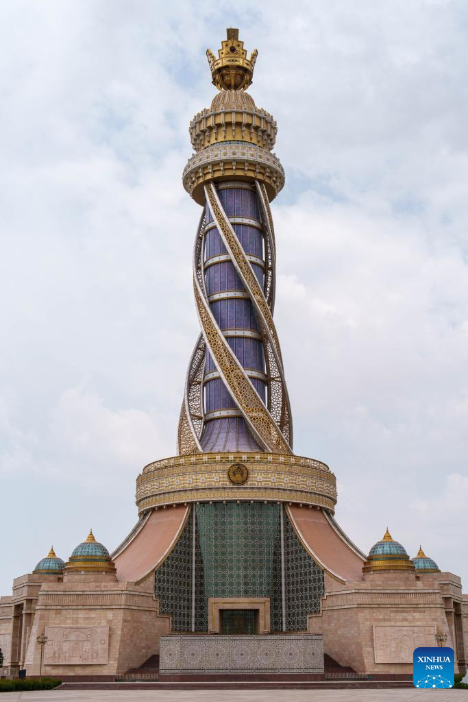 This photo taken on June 26, 2024 shows the Independence and Freedom Monument in Dushanbe, Tajikistan. Tajikistan is located in the southeast of Central Asia, with a mountainous area exceeding 90% of its total area. Dushanbe is the capital of Tajikistan and the economic and cultural center. (Xinhua/Cao Yang)