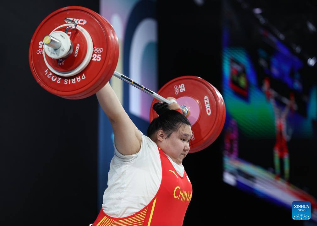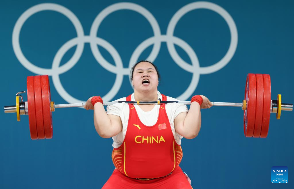 Li Wenwen of China competes during the weightlifting women's +81kg competition at the Paris 2024 Olympic Games in Paris, France, on Aug. 11, 2024. (Xinhua/Zheng Huansong)