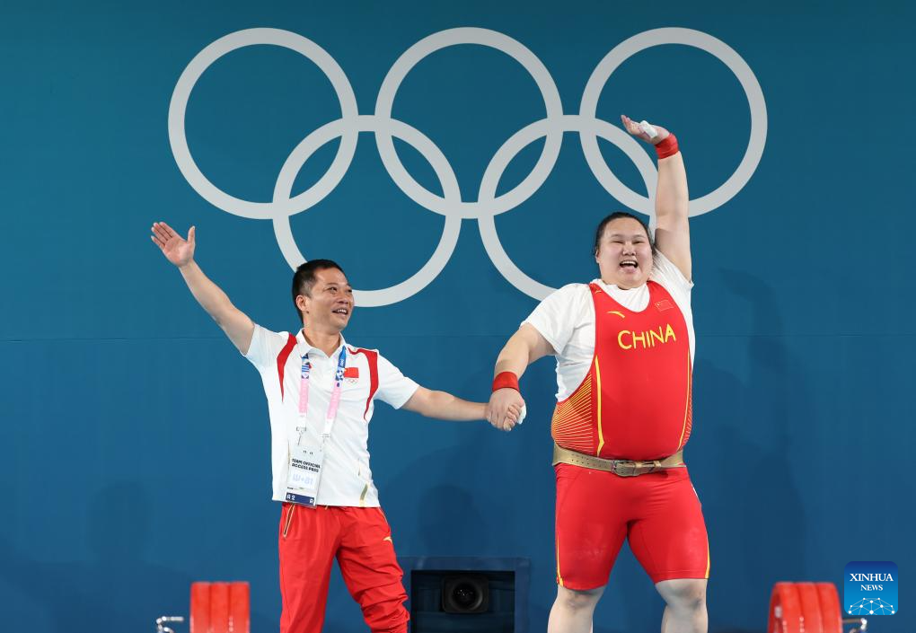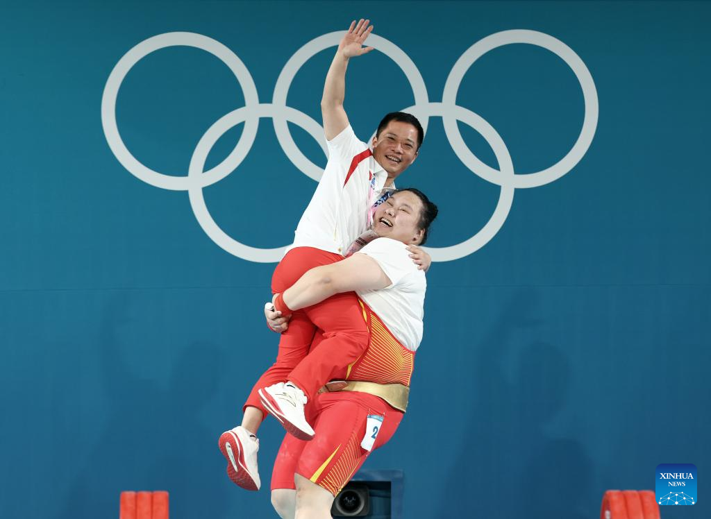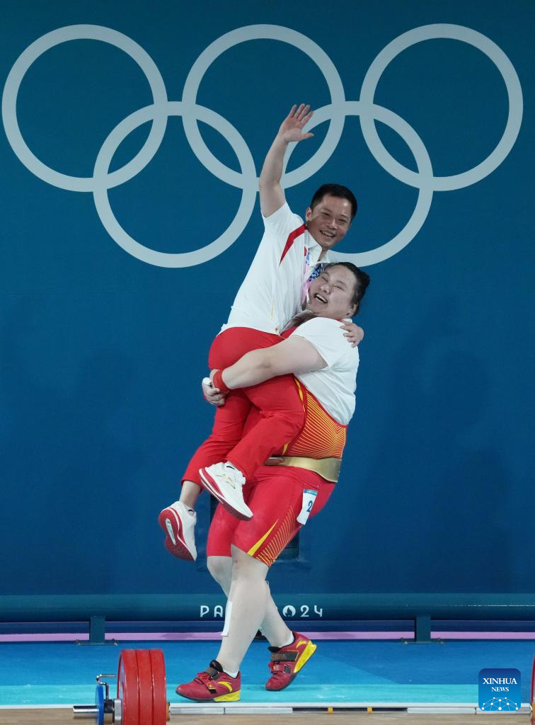 China's Li Wenwen (R) celebrates with her coach Wu Meijin after the weightlifting women's +81kg competition at the Paris 2024 Olympic Games in Paris, France, on Aug. 11, 2024. (Xinhua/Yang Lei)