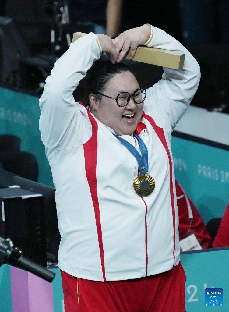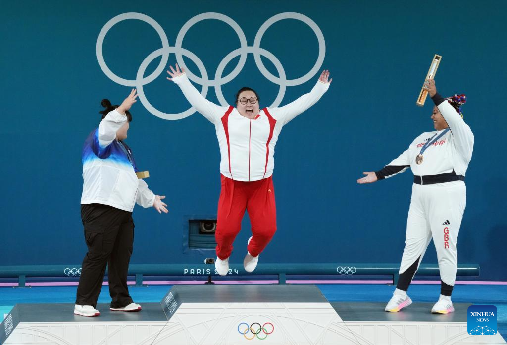Gold medalist Li Wenwen of China attends the awarding ceremony after the weightlifting women's +81kg competition at the Paris 2024 Olympic Games in Paris, France, on Aug. 11, 2024. (Xinhua/Yang Lei)