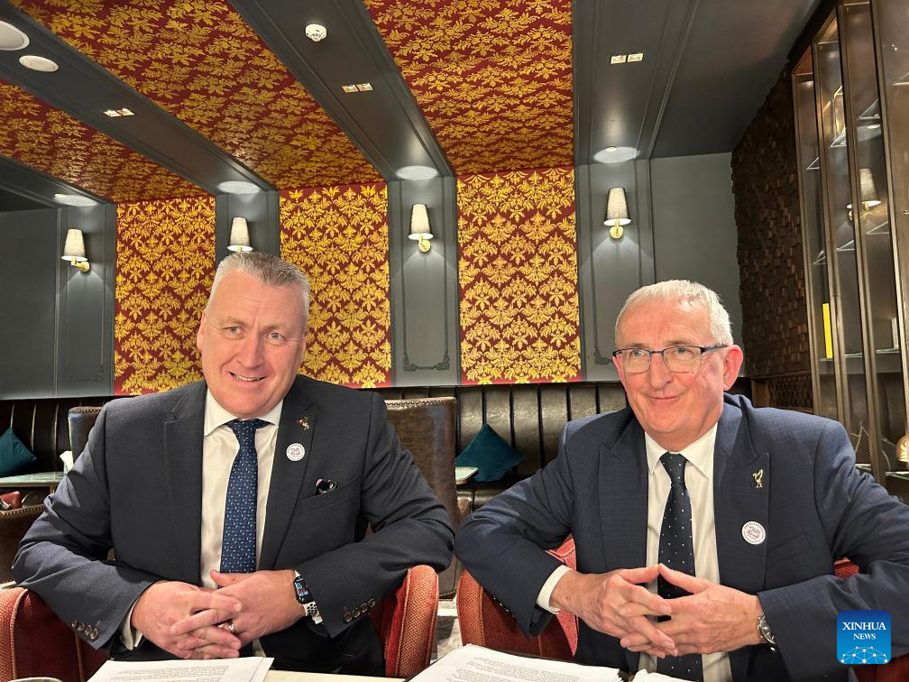 Mike Wharton (R), deputy mayor of the Liverpool City Region, and Richard McGuckin, deputy chief executive of Liverpool City Region Combined Authority, are interviewed in southwest China's Chongqing Municipality, March 19, 2025. (Xinhua/Zhou Bintao)