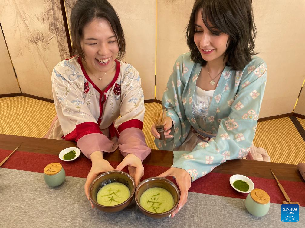 This file photo taken on March 29, 2022 shows Yu Chi-Hsuan (L) introducing to foreign visitors the Song Dynasty-style tea whisking skills at a tearoom in Hangzhou Luyuquan tea culture theme park in Hangzhou, east China's Zhejiang Province. (Xinhua/Duan Jingjing)