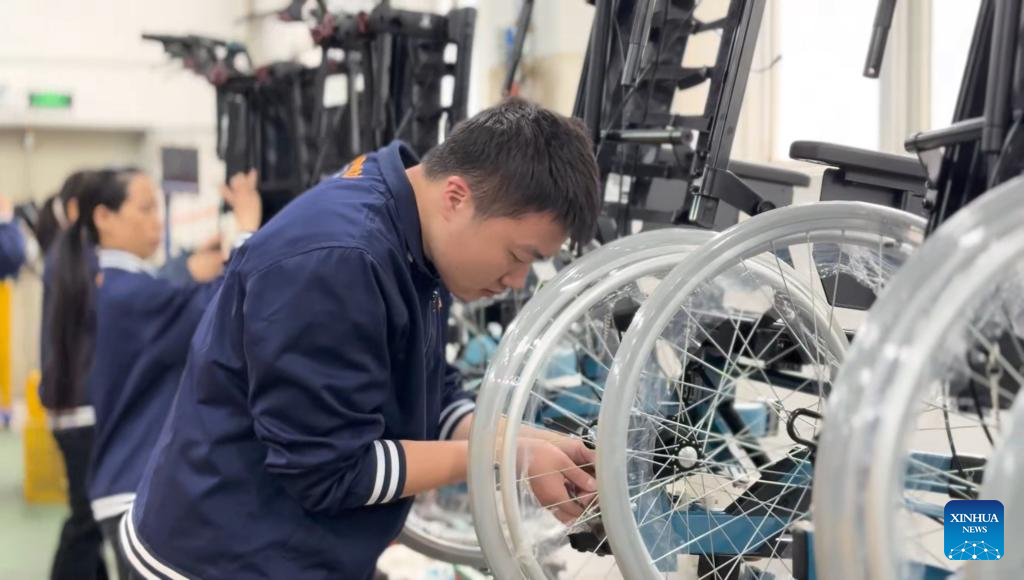 A worker assembles wheelchairs at the workshop of Alu Rehab (Xiamen) Co., Ltd. in Xiamen, southeast China's Fujian Province, Feb. 26, 2025. (Xinhua/Fu Min)