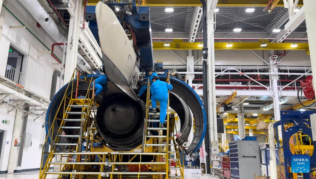 Maintenance engineers repair an engine at the engine overhaul workshop of Taikoo Engine Services (Xiamen) Co., Ltd. in Xiamen, southeast China's Fujian Province, March 6, 2025. (Xinhua/Fu Min)