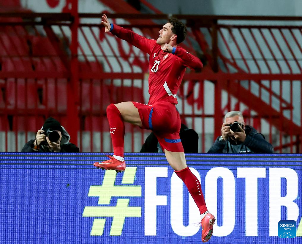 Serbia's Dusan Vlahovic celebrates his goal during the UEFA Nations League play-offs 2nd leg football match between Serbia and Austria in Belgrade, Serbia, March 23, 2025. (Photo by Predrag Milosavljevic/Xinhua)